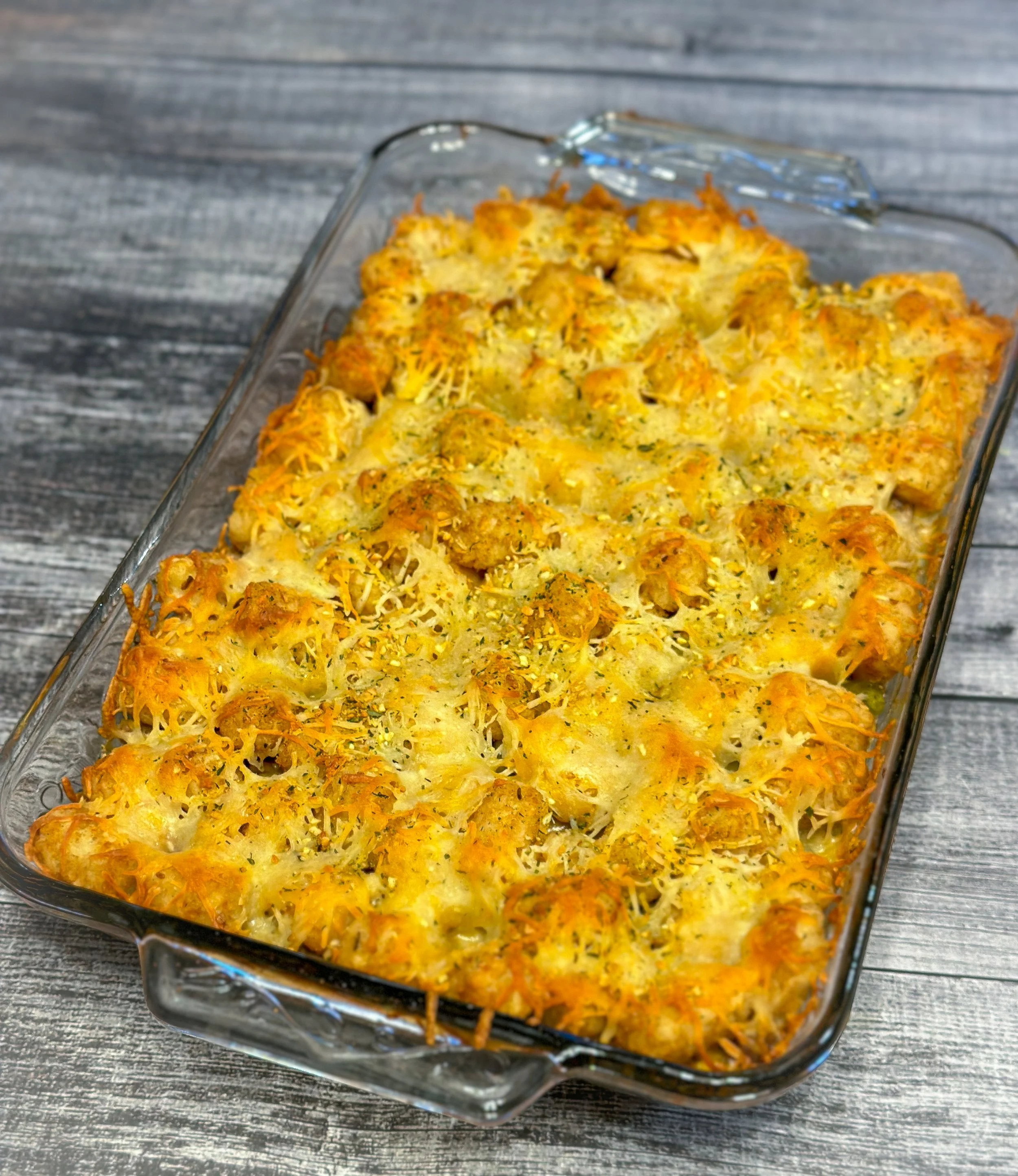 - Sprinkle a little more garlic to the top and pop into the oven for 45 minutes, or until tater tots are golden brown and the cheese is melted. - Enjoy!
